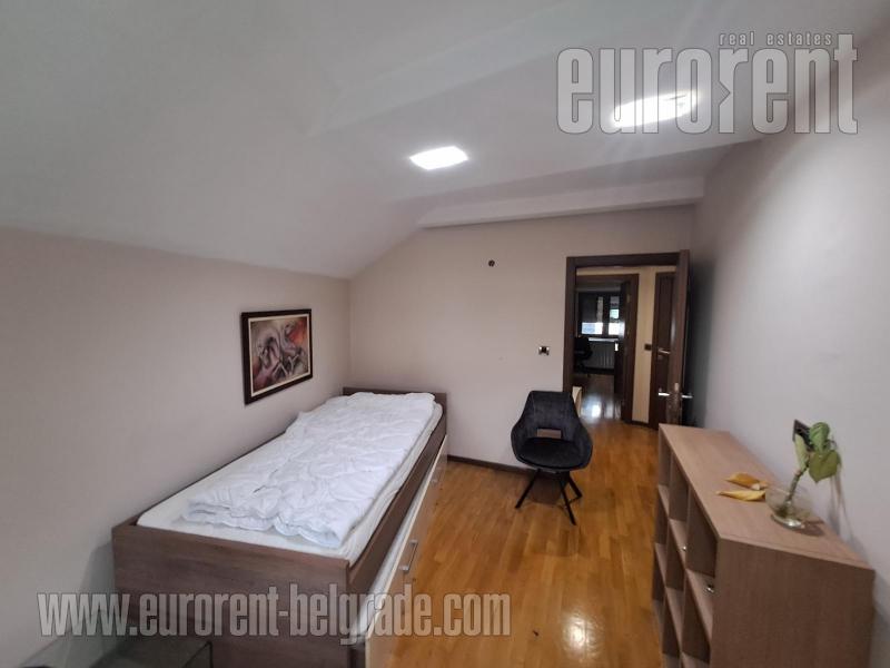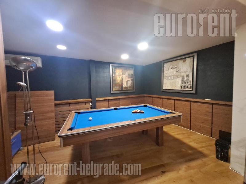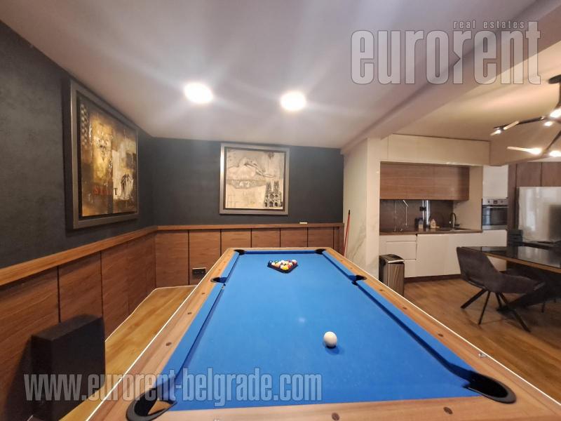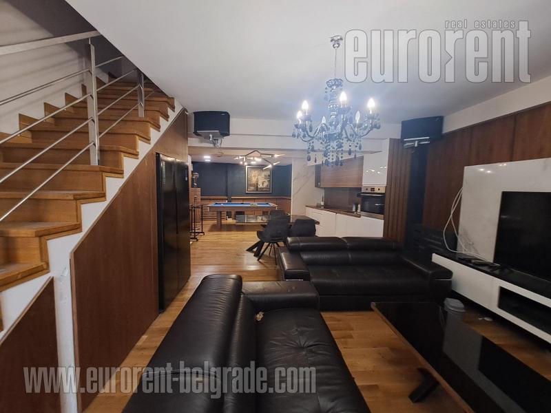 Modern duplex housed on the first floor of a renovated villa in a quiet street near Južni boulevard. The lower level includes a bathroom and a large living room interconnected with kitchen and dining room and has access to the terrace. The upper level consists of three bedrooms and a bathroom. Modern interior and furniture make this space suitable for the life of a modern family. In the living area, there is also an entertainment area with a pool table. Glassed-in terrace is pre entrance area next to the front door, where a set of drying and washing machines are placed, as well as a set of chairs/tables for sitting. Fully equipped, attractive, suitable for variety of business activities.