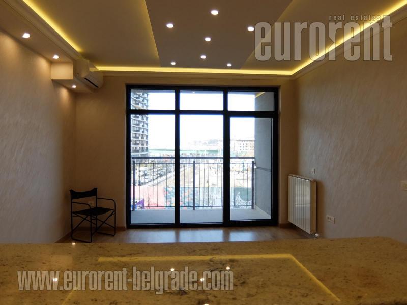 Attractive apartment, located within an exclusive location, in a modern building complex Belgrade Waterfront. The project is managed according to highest architectural standards. The apartment is situated in one of the towers surrounded by greenery and parks, overlooking the entire city. It consists of an entrance area which leads straight into the living room with dining area and a kitchen, with access to a terrace. Kitchen is fully equipped with all necessary built in elements and appliances. Sleeping block features one bedroom with wardrobe and a bathroom with a bathtub. The apartment is equipped with new, high quality furniture. There is one garage space at disposal for the tenant, in building's garage.