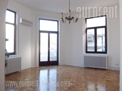 Excellent apartment on a beautiful location in Vracar. Located in the vicinity of Vuk monument, as well as Kalenic green market it is positioned in a quiet part of the street. Housed on the third floor of a relatively new building, this apartment occupies the entire floor. It consists of two units, featuring public and private areas. From the entrance one can enter a living room with dining area, which are partially separated with a wall, while study room is also part of this open concept. Kitchen is separated and fully equipped. This part of the apartment has two smaller terraces oriented toward the street, two bathrooms, one of which has a bathtub, while the other is equipped with a shower cabin, as well as a smaller utility room in the hallway. The apartment has many closets both in the rooms and in the hallway, so it has a lot of storage space in addition to the utility room. Living room is equipped with a sofa, large TV, a shelf, as well as equipped study room. The apartment is abundant with natural light and has a lot of window surfaces. Interior is attractive and well maintained. There is one parking space in building's garage space, while there is a possibility of renting an additional space. The apartment is leased semi-furnished, but there is a possibility of different arrangement. Excellent property suitable for family life or as an office space.