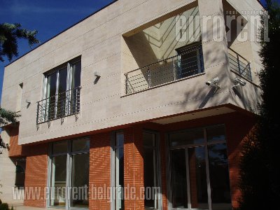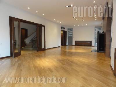 Freshly renovated prewar villa, with subtle, elegant exterior, of minimalist architectural design and simple form. High ground floor has two entrances. Main entrance leads into a smaller anteroom with a guest restroom, followed by a more spacious central anteroom with access to each room and central staircase. This level features a living room with a spacious terrace, admittance parlor with a fireplace, dining area, kitchen and a bathroom with a bidet and a restroom. Kitchen is fully equipped. Second entrance has access to the kitchen and dining area. First floor features three bedrooms with separated bathrooms (large bathtub and a bidet). Master bedroom has access to an additional room, which could be used as a walk in wardrobe or a study room, it also has a terrace and a large private bathroom. Other two rooms have built in wardrobes, while one of them also has a terrace. Terraces are overlooking the river, dock and Belgrade Waterfront. Floors on the upper two levels are covered in original oak parquet. Ground floor has an apartment with area for a kitchenette and a bathroom, featuring a living room and an office next to a glassed in terrace, which is in level with the lawn and completely opens towards backyard. Garage area has a pantry, automatic doors and space for one vehicle. Restroom, laundry room, storage and boiler room. High ceiling. Electricity or fuel oil heating. Internet connection, cable TV, land line. New alarm and fire protection systems. AC. Two pedestrian gates with intercom and camera, as well as two car gates. Parking space for two vehicles. Property suitable for family life or for business premises. Within only five minute driving distance there is an International school, kindergartens, numerous restaurants and cafes (Rustique, Sheher, Bizu, Graficar, W), supermarkets (Maxi, Aroma), green market, post office, Hyde park etc. House has three entrances, separate apartment on the ground floor, garage office/gym/entertainment room. Highly recommended property, rarely available on the market.